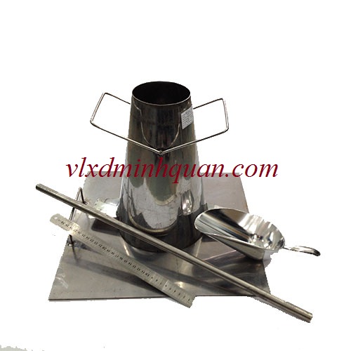 Một bộ Côn thử đọ sụt của bê tông gồm 7 sản phẩm: côn chuẩn, phễu hứng, tấm lót, thanh đầm, ca xúc, thước lá, bay thép.